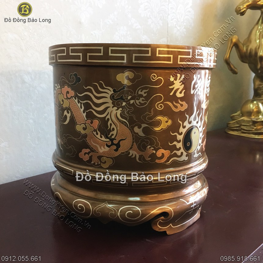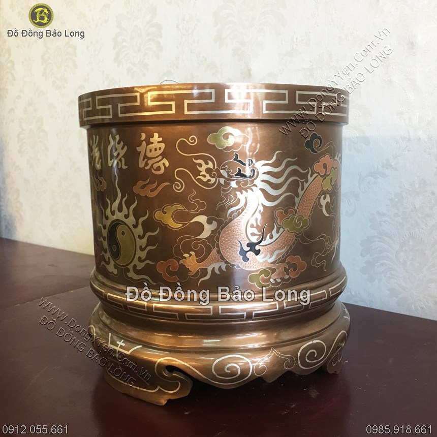 Bát hương đường kính 20cm đúc thủ công bằng đồng đỏ, khảm tam khí cao cấp (khảm bạc, đồng đỏ, đồng vàng, đồng đen), khảm lưỡng long chầu nguyệt riêng mặt trước khảm thêm 3 chữ Đức Lưu Quang chữ Nho rất đẹp và độc đáo.