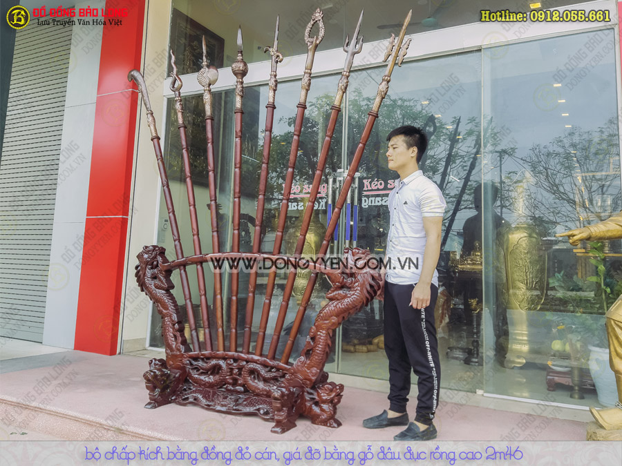 Bộ Chấp kích lưỡi đúc bằng đồng đỏ tinh xảo theo mẫu cổ, cán và chân giá gỗ đục rồng tinh xảo bằng gỗ Dâu đẹp, cao tổng thể 2m45