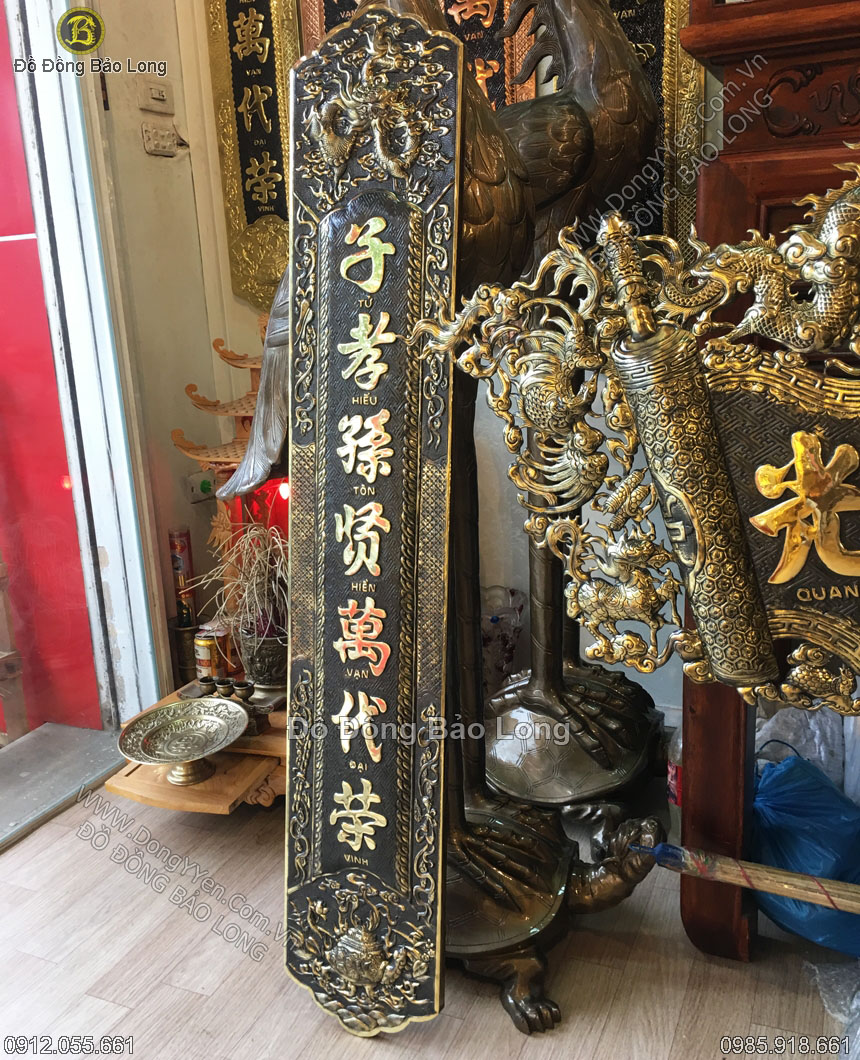 Bộ cuốn thư câu đối hàng chạm tay thủ công bằng đồng vàng dày 8rem, tạo màu giả cổ nâu vàng cực đẹp kích thước 1m35