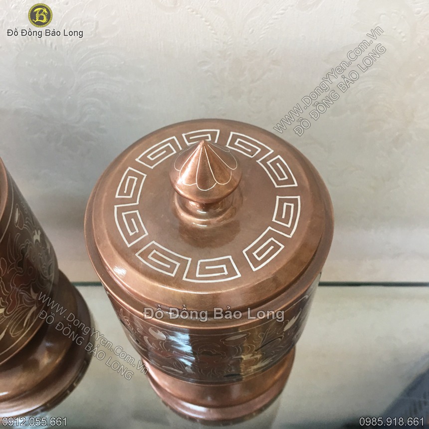 Bộ Đài thờ hàng khảm kỹ đường kính 10cm loại cho bàn thờ từ 1m76 trở lên, đúc thủ công bằng đồng đỏ, khảm tinh xảo hoa sen và chữ thọ, khảm cả bạc, đồng vàng, đồng đỏ, đồng đen cực đẹp mắt