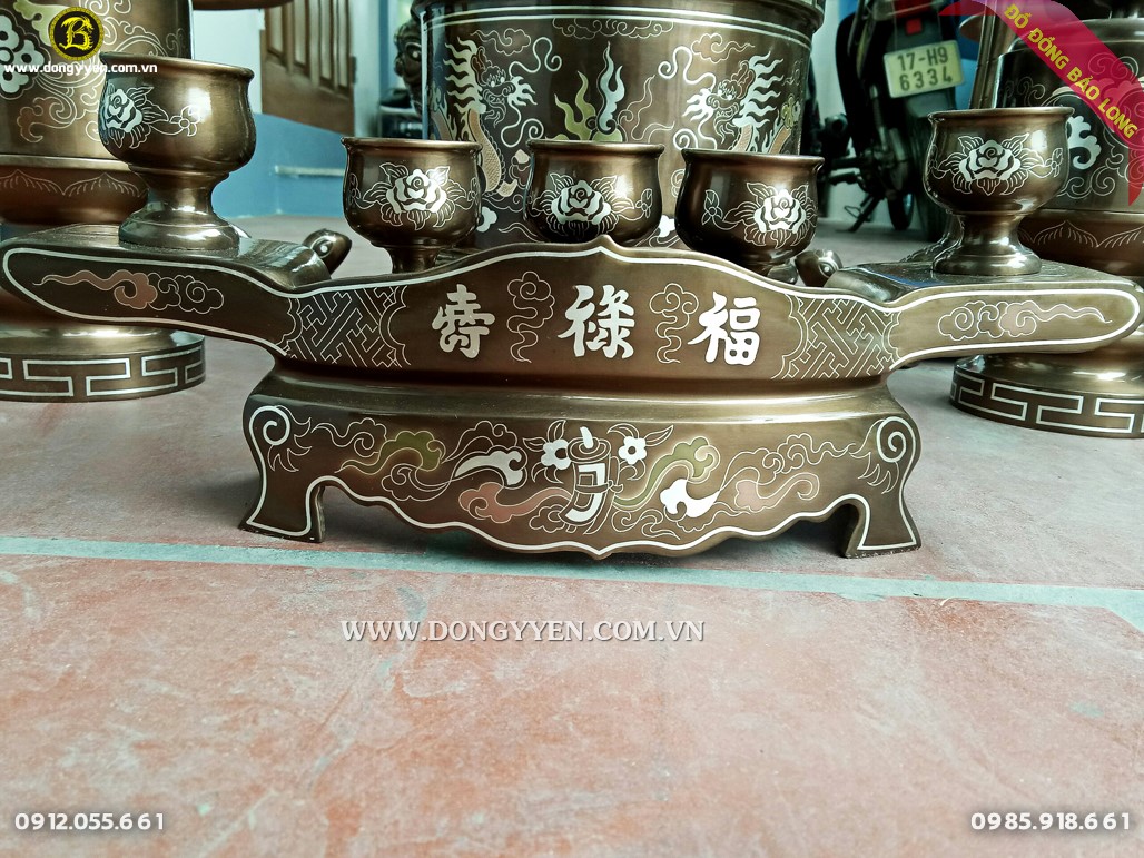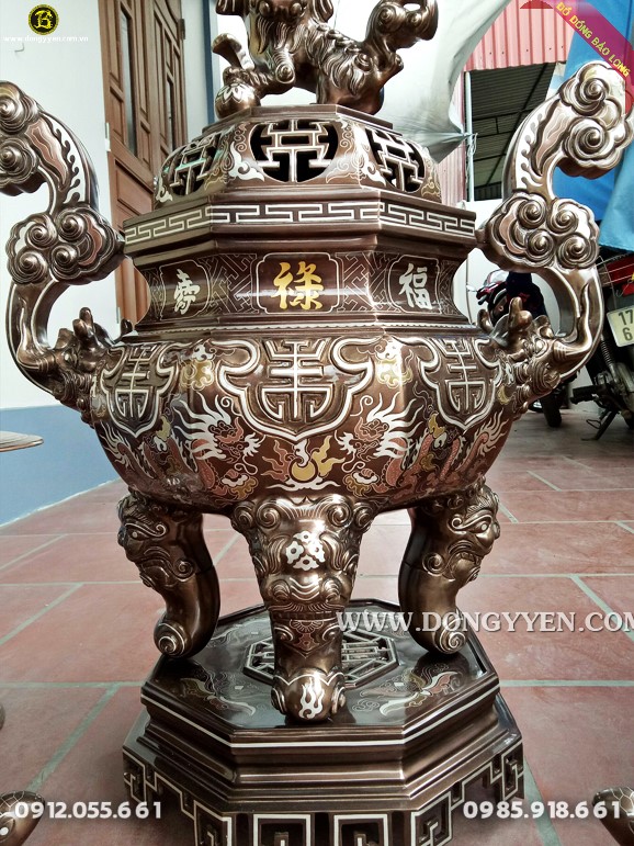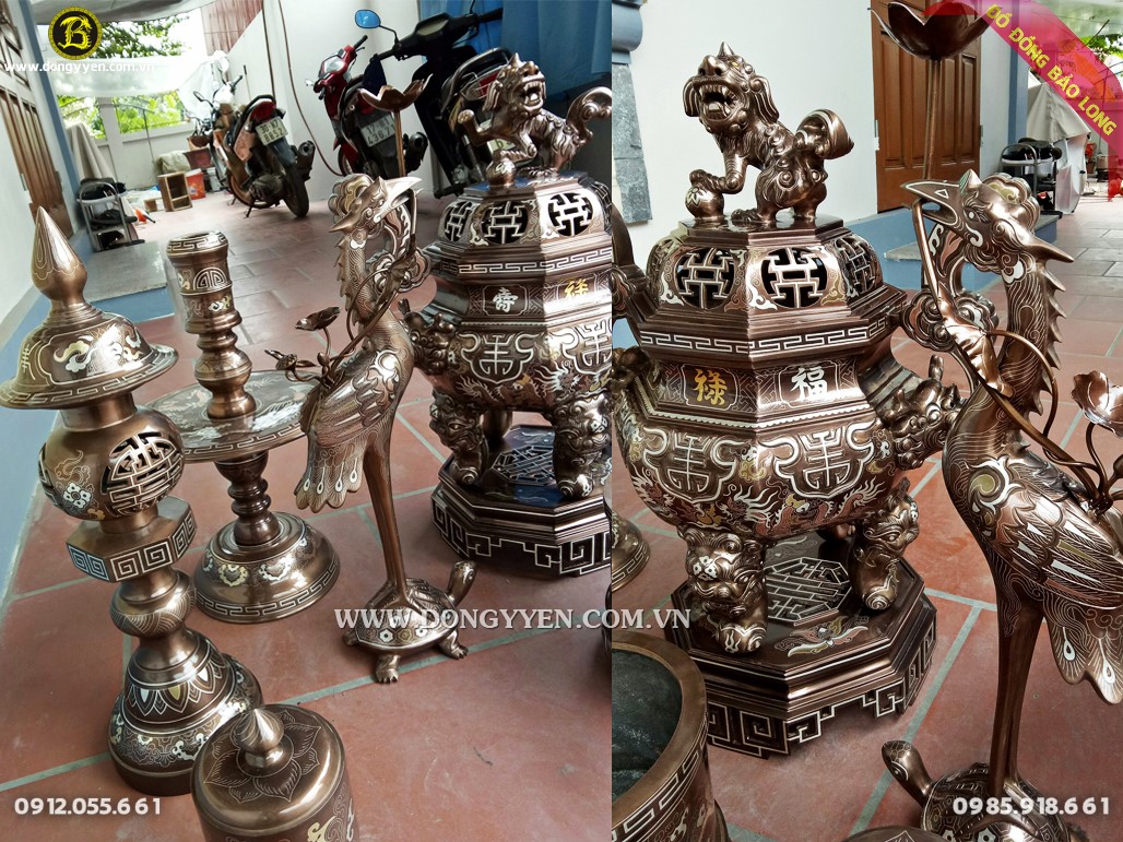 Bộ đồ thờ đỉnh bát giác đầy đủ cao 70cm khảm tam khí cao cấp cho nhà thờ họ Đoàn Xuân ở Ứng Hòa - Hà Nội, đúc thủ công bằng đồng nồi, khảm tinh xảo