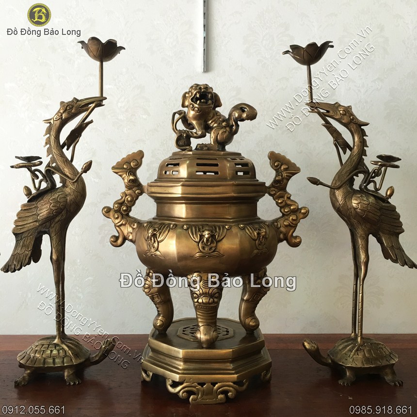 Bộ đồ thờ ngũ sự gồm 1 đỉnh đồng bát giác dơi ngậm tiền và đôi hạc, đôi chân nến đúc thủ công bằng đồng thau màu giả cổ hun xanh cao 50cm đẹp