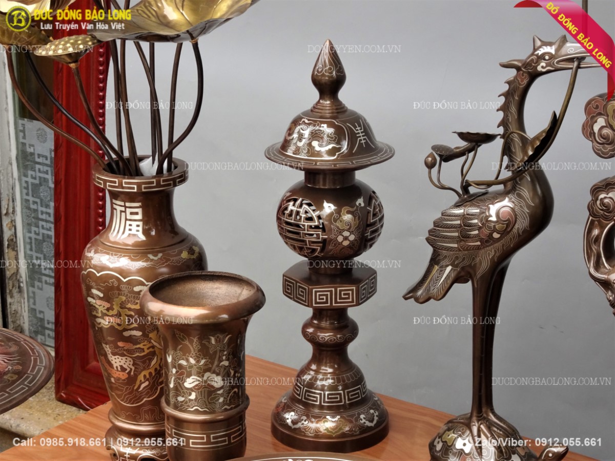Bộ đồ thờ khảm tam khí cao 60cm đỉnh khảm 1 chữ vàng 9999 hàng cao cấp đầy đủ các món, được chế tác thủ công bởi nghệ nhân