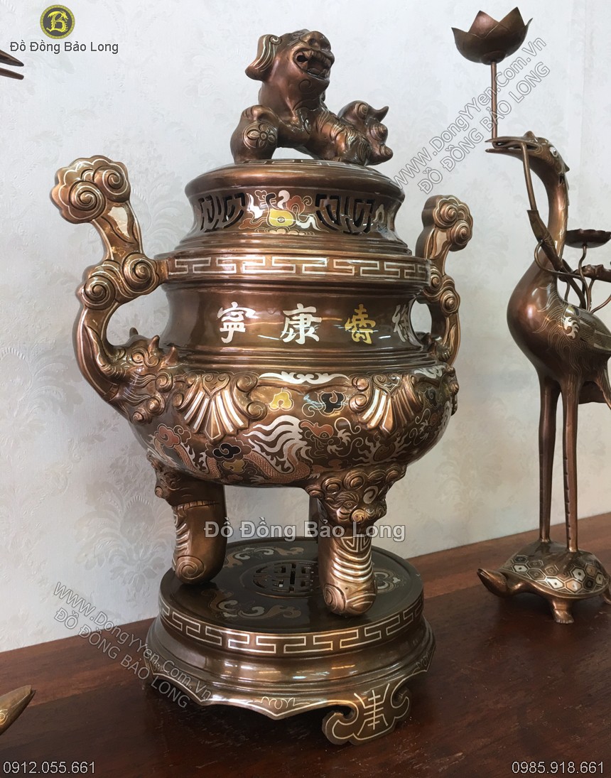 Bộ Đồ Thờ gồm 1 Đỉnh Đồng, 2 hạc, 2 chân nến đúc bằng đồng đỏ cao 50cm, khảm tam khí kỹ (khảm bạc, đồng đỏ, đồng vàng, đồng đen và 1 chữ vàng 9999) trên thân đỉnh. Đường nét khảm chau chuốt, sắc nét, mặt trước là song long chầu nguyệt và 5 chữ Phúc Lộc Thọ Khang Ninh trong đó chữ Thọ bằng vàng 9999, mặt sau khảm phượng và 3 chữ Đức Lưu Quang. Bộ đồ thờ này phù hợp với bàn thờ 1m76.