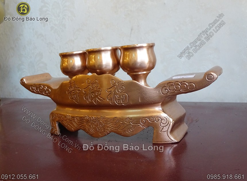 Bộ khay 3 chén gồm 1 khay và 3 ly nước được đúc thủ công bằng đồng đỏ thanh khiết màu mắt cua chạm ám hoa văn tinh xảo.