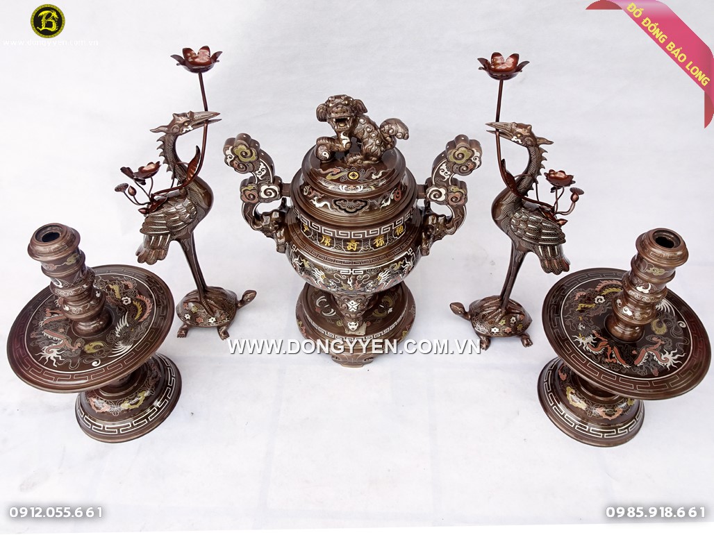 Bộ đồ thờ ngũ sự gồm 1 đỉnh, 2 hạc và 2 chân nến đúc thủ công bằng đồng nồi cao 60cm, khảm ngũ sắc (khảm vàng ta 9999, bạc 9999, đồng đỏ, đồng đen và đồng xanh) cao cấp, riêng đỉnh khảm cổ gấm 5 chữ vàng (phúc, lộc, thọ, khang, ninh) dùng cho bàn thờ từ 1m97-2m17.