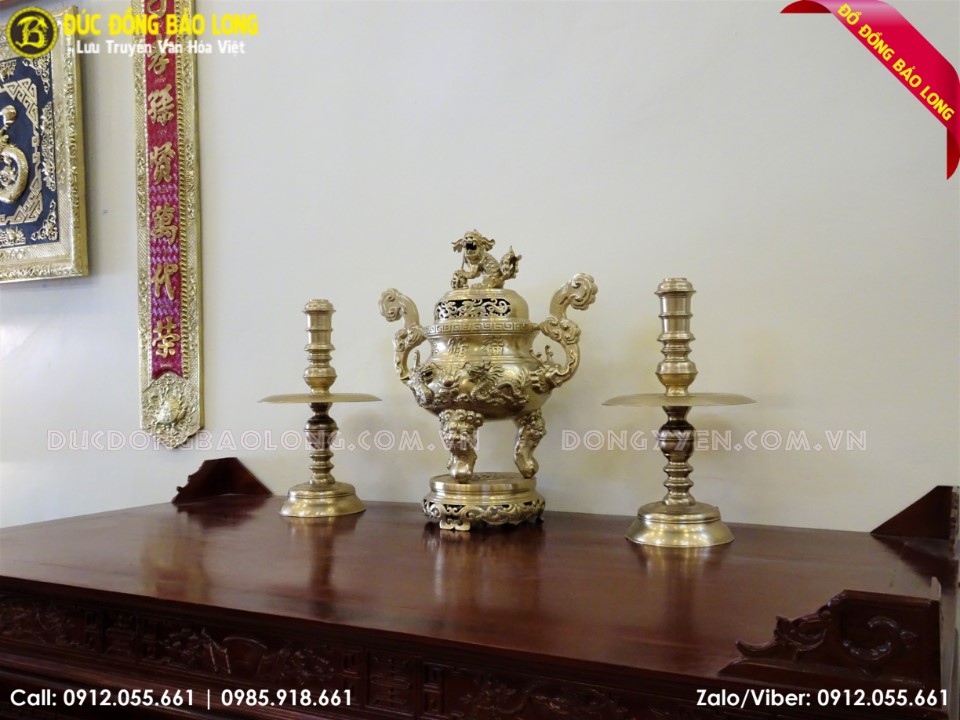 Bộ tam sự nến đỉnh rồng được chế tác thủ công tinh xảo, mẫu mã đẹp, giá thành vừa tầm, phù hợp với nhiều gia đình. Bộ đồ thờ được chế tác riêng cho bàn thờ kích thước 2m17 trở lên.
