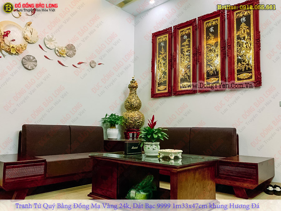 Tranh tứ quý bằng đồng hàng chạm tay nghệ nhân mạ vàng 24k toàn bộ, dát điểm bạc 9999 khung gỗ hương đá đục hoa hồng 1m33x47cm cực đẹp lắp tại TP. Bắc Giang