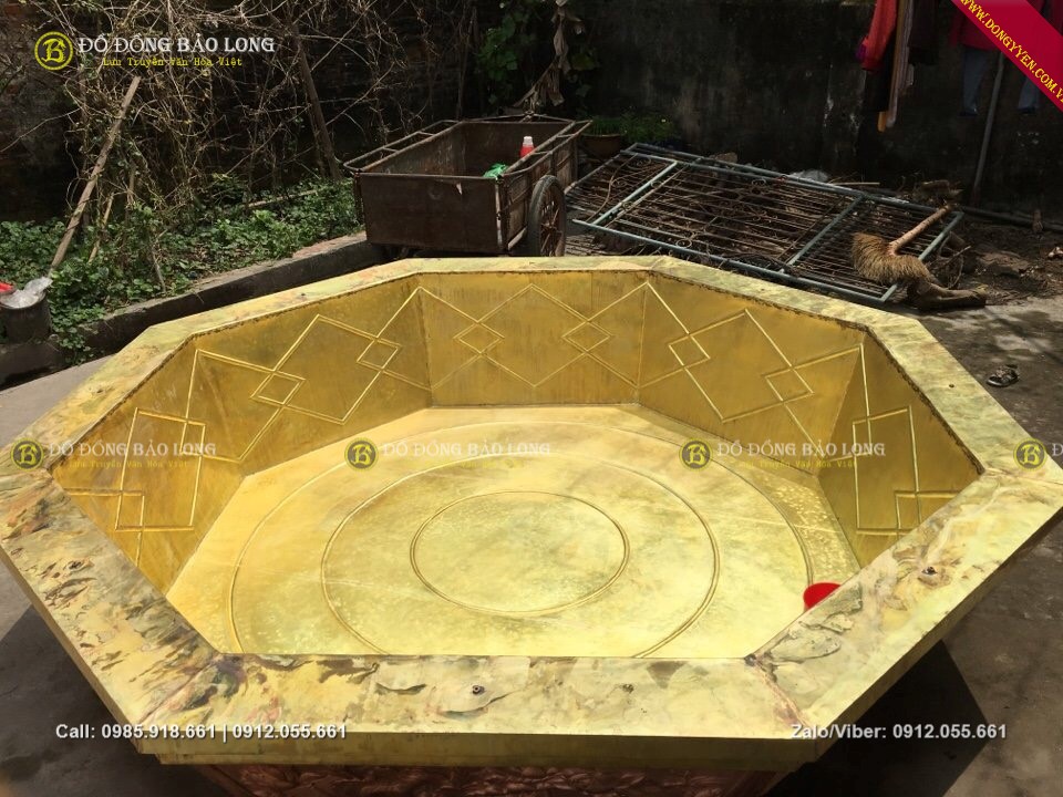 Bồn tắm phật được chế tác thủ công bằng đồng vàng theo phương pháp gò thúc, chạm công phu tỉ mỷ, độ chính xác cao nhờ tay nghề thợ tốt. Bồn tắm phật có dạng hình Bát Giác rộng 2m4 cao 80cm trong có gia cố khung xương thep không gỉ, gồm 2 lớp đồng dày từ 1,2-2ly mặt trong và mặt ngoài, hoa văn chạm hình hoa sen tinh xảo đẹp mắt, bên ngoài hạ màu giả cổ trong lòng đánh vàng sáng màu nguyên bản của đồng.