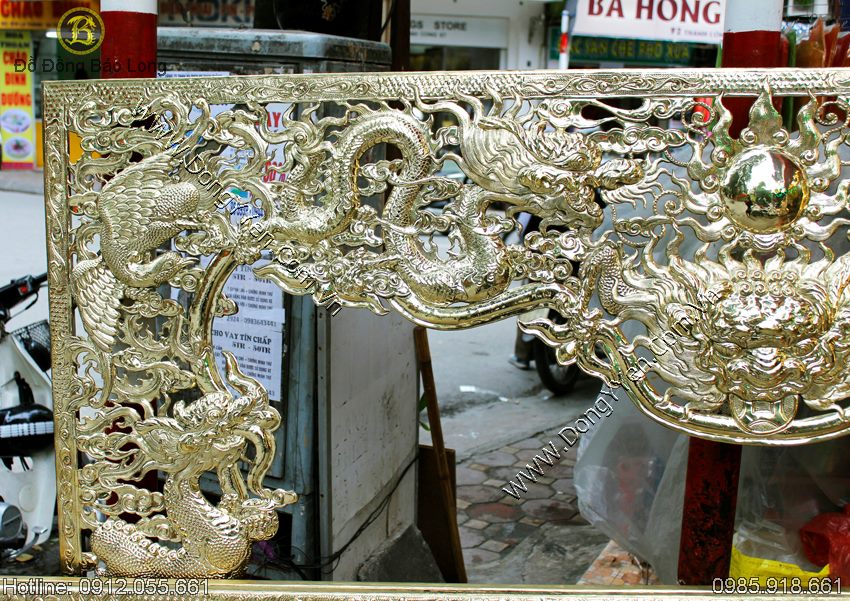 Bộ Cửa Võng và đại tự Ngũ phúc lâm môn bằng đồng vàng chạm thủ công bằng tay, đồng dày 1ly, cho phòng thờ gia tiên