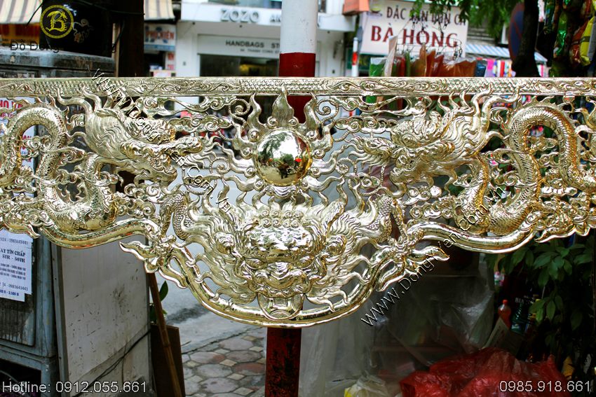 Bộ cửa võng bằng đồng thiết kế riêng cho không gian phòng thờ gia đình đi cùng với đại tự Ngũ Phúc Lâm hàng cao cấp cực đẹp. Chiều dài của cửa võng và đại tự bằng nhau 2m17, chiều cao của cửa võng 1m45, của đại tự là 69cm thuộc loại hàng đặt làm kỹ, chạm tay hoàn toàn, chất liệu đồng vàng dày 1ly, khung xương hoàn toàn bằng inox 304.