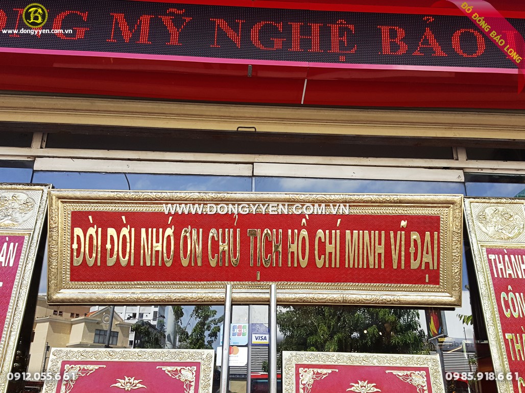 Bộ đại tự câu đối và các khẩu hiệu hàng đặt tại phòng thờ bác hồ của Hải Quân vùng 5 Phú Quốc chạm tay thủ công bằng đồng vàng
