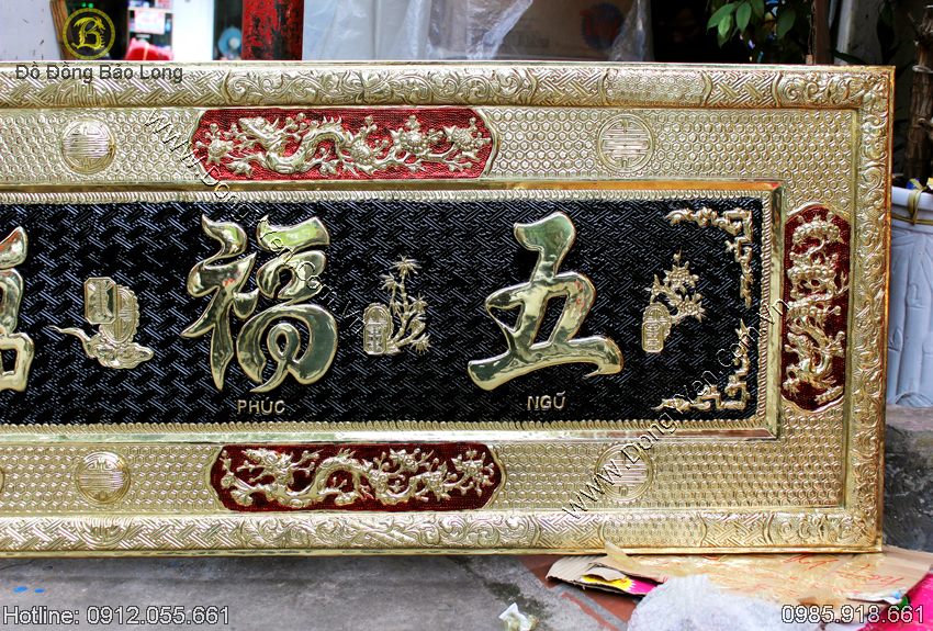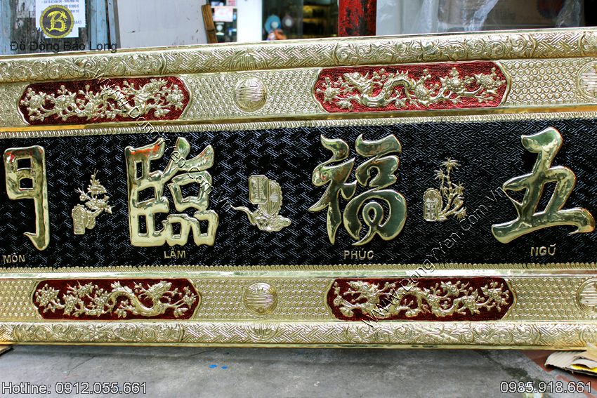 Đại Tự Ngũ Phúc Lâm Môm 2m17 hàng chạm tay cao cấp bằng đồng vàng cực đẹp, dùng cho thờ cúng gia tiên.