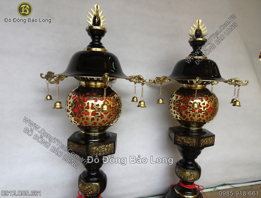 Đôi đèn thờ cao 90cm đúc bằng đồng vàng màu đen vàng có chuông gắn trên vành đèn, trong có bóng điện đỏ cho ban thờ lớn