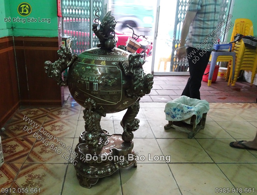 Đỉnh đồng quả bóng hay đỉnh cầu thất lân cao 1m1 đúc thủ công bằng đồng nồi khảm ngũ sắc cao cấp 11 chữ vàng