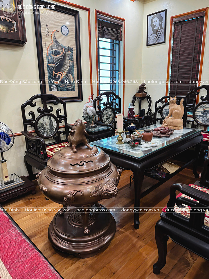 Không gian bày trí Đỉnh đồng Dơi Phúc bằng đồng đỏ màu giả cổ cao 1m07