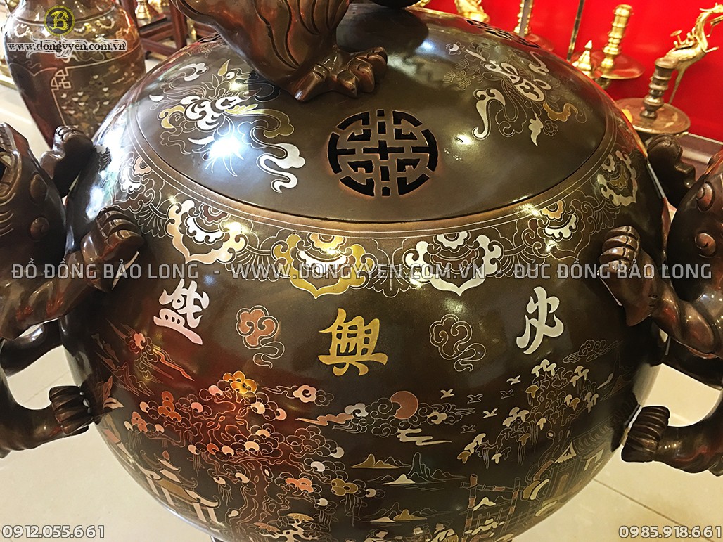+ Quy cách: đúc thủ công bằng đồng nồi, khảm tam khí cao cấp