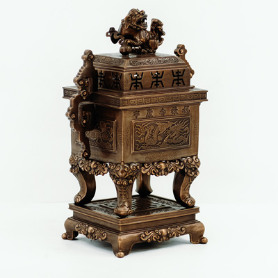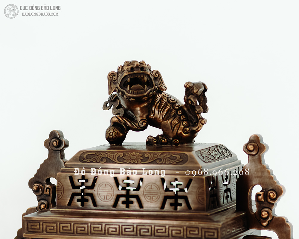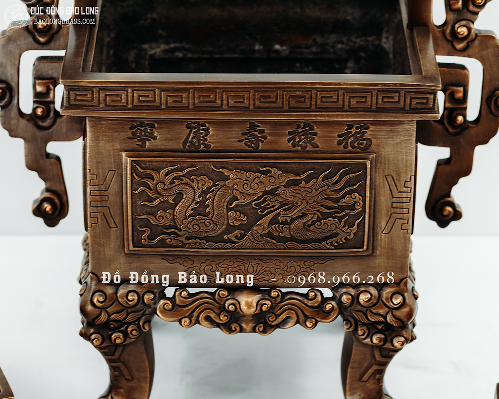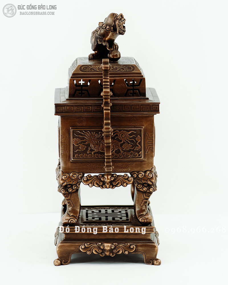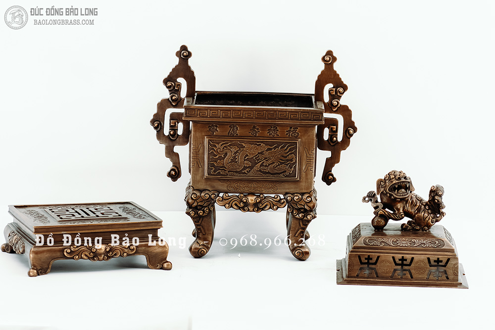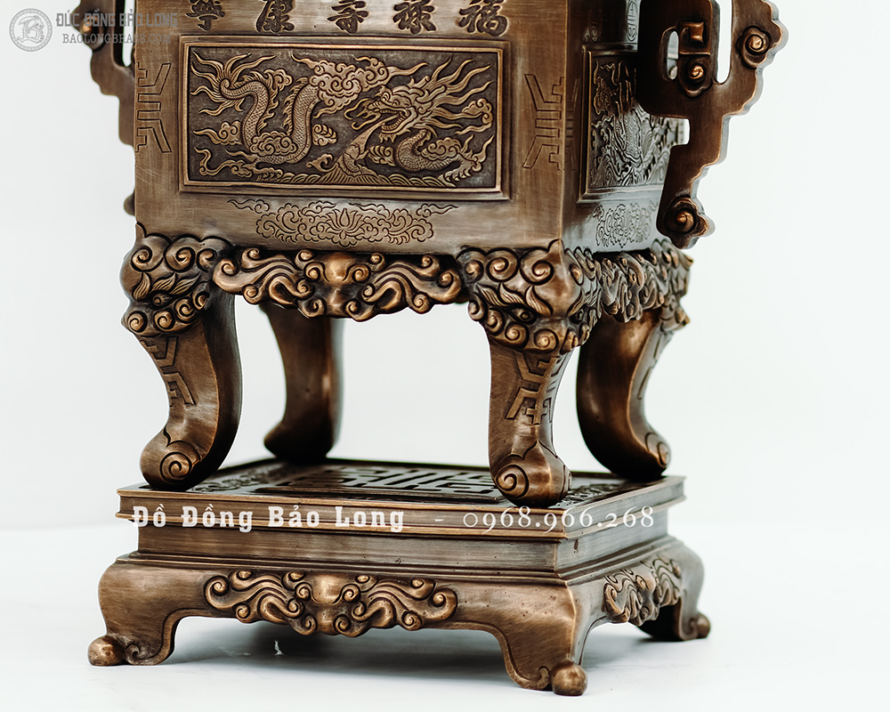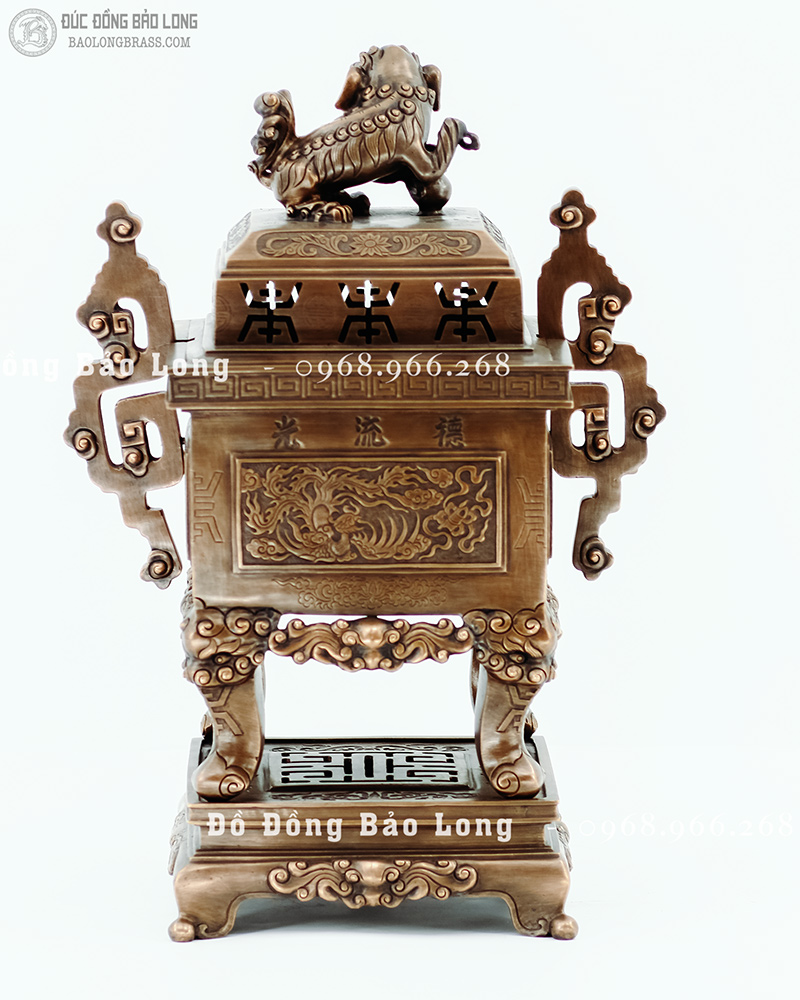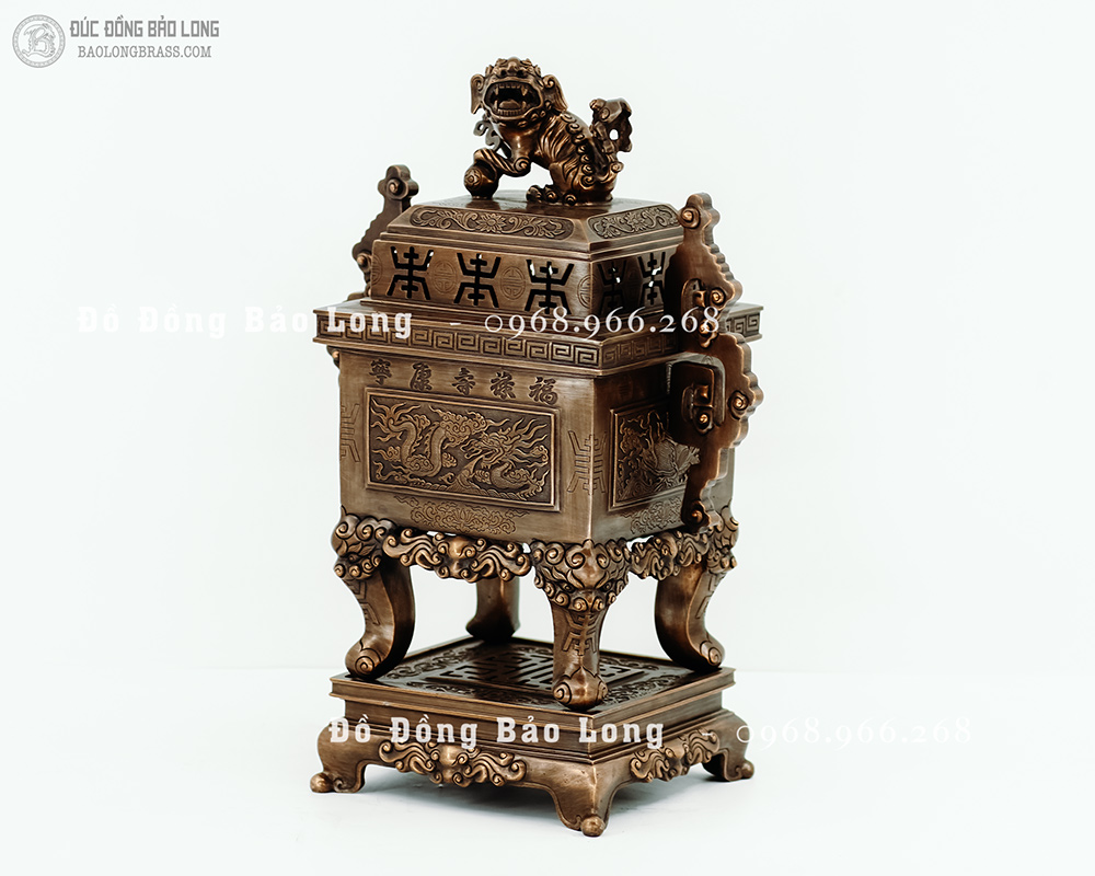 Đỉnh vuông tai chiện mẫu cổ từ cung đình xưa, đúc bằng đồng đỏ thanh khiết, đục nổi long ly quy phụng màu giả cổ cực kỳ đẳng cấp hàng độc quyền tại Bảo Long