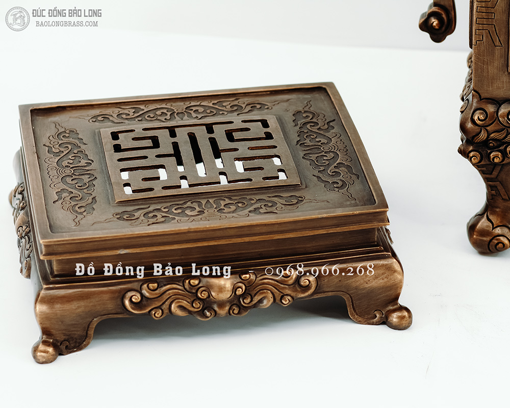 Đỉnh vuông tai chiện mẫu cổ hàng nghệ nhân, được nhân bản từ mẫu đỉnh của cung đình xưa, đỉnh được cơ sở Bảo Long đúc bằng đồng đỏ thanh khiết, đục nổi long ly quy phụng màu giả cổ cực kỳ đẳng cấp hàng độc quyền tại Bảo Long.