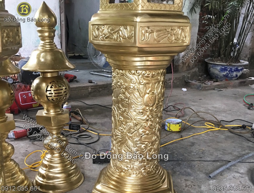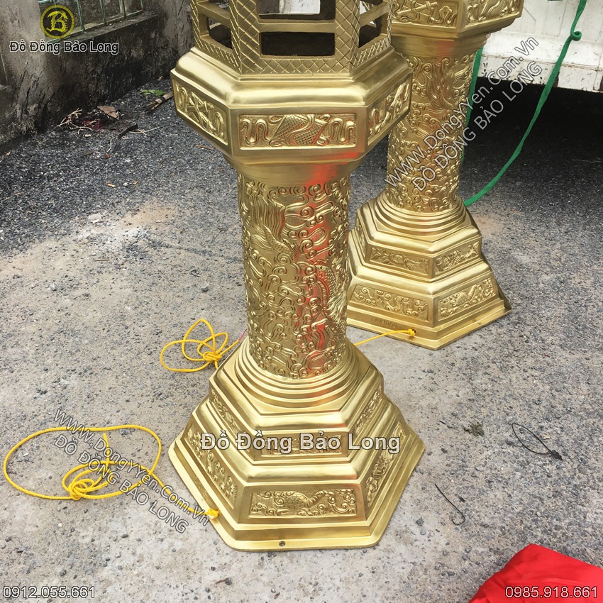 Đây là một trong những mẫu đèn để dưới trệt rất đẹp cho các công trình tâm linh như đền, chùa, nhà thờ, điện thờ, phủ...Đèn cao 1m55 theo thước đẹp, trên có là búp sen có mái như kiến trúc đền chùa 6 mặt (lục giác), cột đèn có rồng nổi chầu mặt nguyệt, chân đèn cũng dạng lục giá nhiều tầng với hoa văn phổ thông là tứ linh (long ly quy phụng), bầu rượu túi thơ, và các đường công, đường chiện đều đẹp mắt. Đôi đèn này do cơ sở chúng tôi chế tác trên chất liệu katut đồng quân sự (loại vỏ đạn 12ly7 đã hết thuốc nổ) nặng chừng 2,3 tạ đồng. Đặc trưng của các sản phẩm đúc bằng cát tút là có màu vàng ánh xanh rất đẹp, độ bền và chất lượng đồng cực tốt (vì những nguyên liệu được điều chế và sử dụng trong quân sự là loại tốt nhất). Đôi đèn này rất phù hợp đặt ở không gian sân đình, chùa, nhà thờ hoặc đặt trong tam bảo, điện, phủ với diện tích rộng.