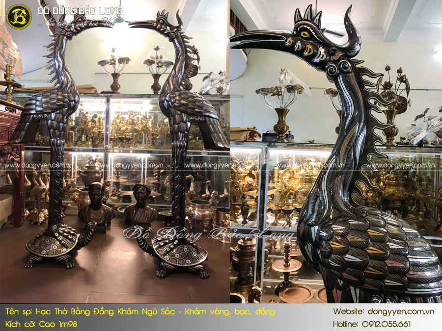 Đôi hạc thờ bằng đồng hàng cao cấp đúc thủ công bằng đồng nồi hè, bề mặt được khảm ngũ sắc gồm vàng, bạc, đồng đỏ, đồng xanh, đồng đen cao 1m98 nặng chừng 250kg