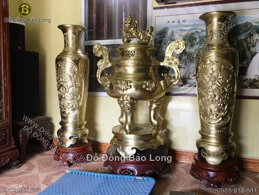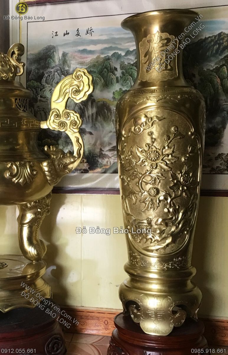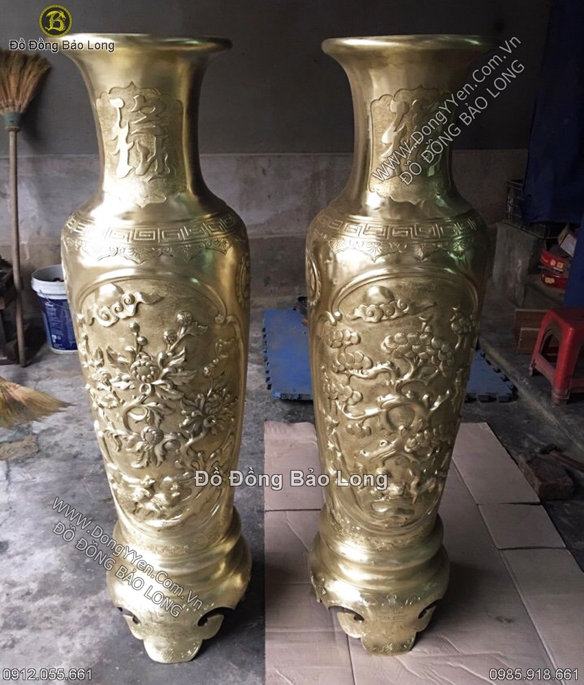 Đây là một trong những đôi lọ lục bình đẹp nhất do cơ sở Bảo Long chế tác. Đôi lọ cao 1m27 được đúc nguyên khối bằng đồng cát tút liên sô, đường nét tinh xảo, màu vàng óng như màu vàng tây cực đẹp. Đôi lọ 1m27 này rất phù hợp để bày phòng khách phòng thờ hoặc làm đồ cung tiến, biếu tặng. Đôi lộ cát tút 1m27 nặng chừng 150kg đồng, một mặt chạm hoa cúc và chữ Lộc mặt kia chạm tùng lộc (cây tùng và chim) cùng chữ Phúc, chân khánh chạm chữ Thọ, xung quanh còn có đường công, đường chiện cánh sen rất đẹp mắt.