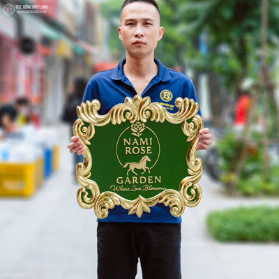 Biển hiệu có hình dáng uốn lượn, với những đường viền mang phong cách châu Âu tân cổ điển, tạo cảm giác sang trọng, quý phái. Toàn bộ viền ngoài được chạm khắc nổi các hoa văn uốn lượn mềm mại, tỉ mỉ, tạo hiệu ứng 3D đẹp mắt và tinh xảo. Biển hiệu kết hợp hai tông màu nổi bật là màu vàng đồng cho phần viền hoa văn và màu xanh rêu cho phần nền. Sự tương phản này không chỉ làm nổi bật tên thương hiệu "Nami Rose Garden" mà còn tạo nên vẻ đẹp độc đáo, bắt mắt và rất ấn tượng. Tên thương hiệu được khắc sắc nét trên nền xanh, với font chữ mềm mại, hài hòa với tổng thể thiết kế.