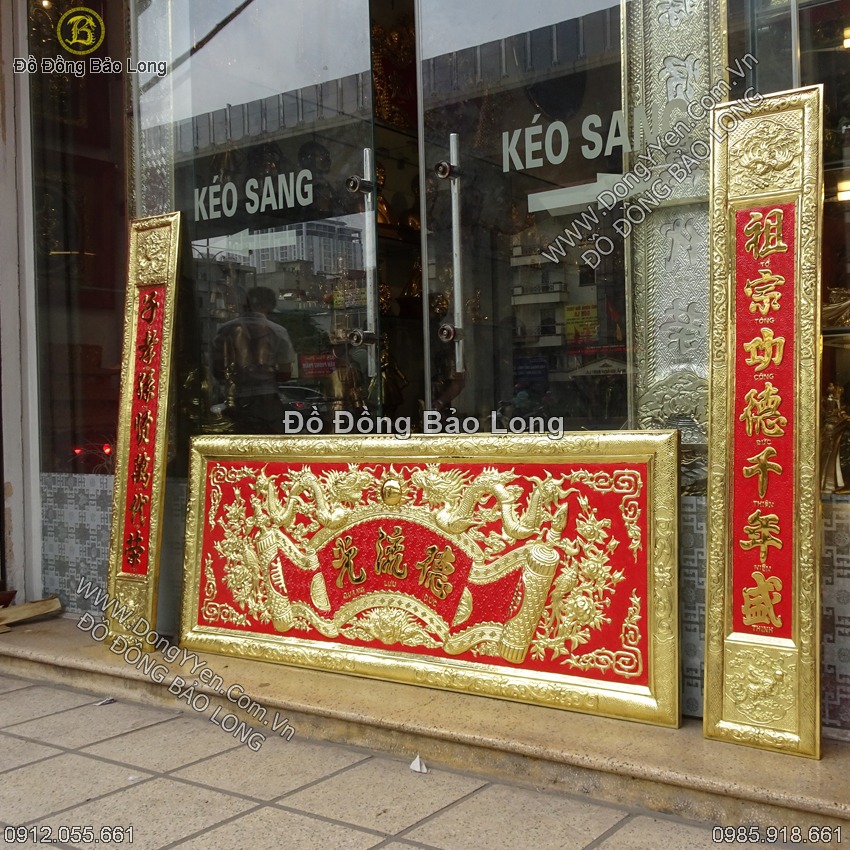 Bộ hoành phi câu đối hàng đặt chạm tay thủ công abwngf đồng dày dặn, mạ vàng toàn bộ chữu nho trên hoành phi 1m55 câu đối 1m27