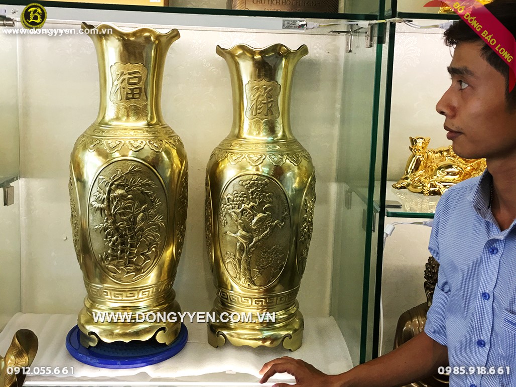 Đôi lộc bình cao 70cm đúc thủ công bằng đồng vỏ đạn của liên xô (đồng katut) 4 mặt gồm tùng cúc trúc mai, cổ có chữ Phúc Và Lộc, là một tác phẩm độc đáo, đẳng cấp được chế tác vô cùng tinh xảo, tỉ mỉ và tâm huyết của đội ngũ nghệ nhân Bảo Long.