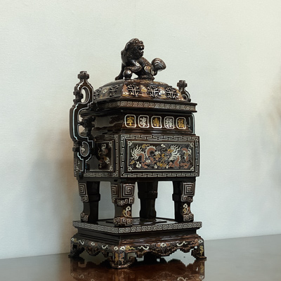 - Đỉnh thờ kiểu dáng vuông - Tai chiên, nắp Nghê, đỉnh vuông 4 chân - Hoa văn khảm ngũ sắc - Họa tiết Rồng Phượng, chữ Hán |
