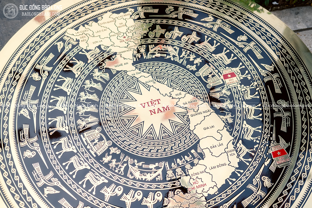 - Họa tiết chuẩn mẫu mặt trống đồng Đông Sơn - Trung tâm là hình bản đồ Việt Nam với 34 tỉnh thành - Mặt sau sử dụng khung xương inox 304 để cố định chắc chắn |