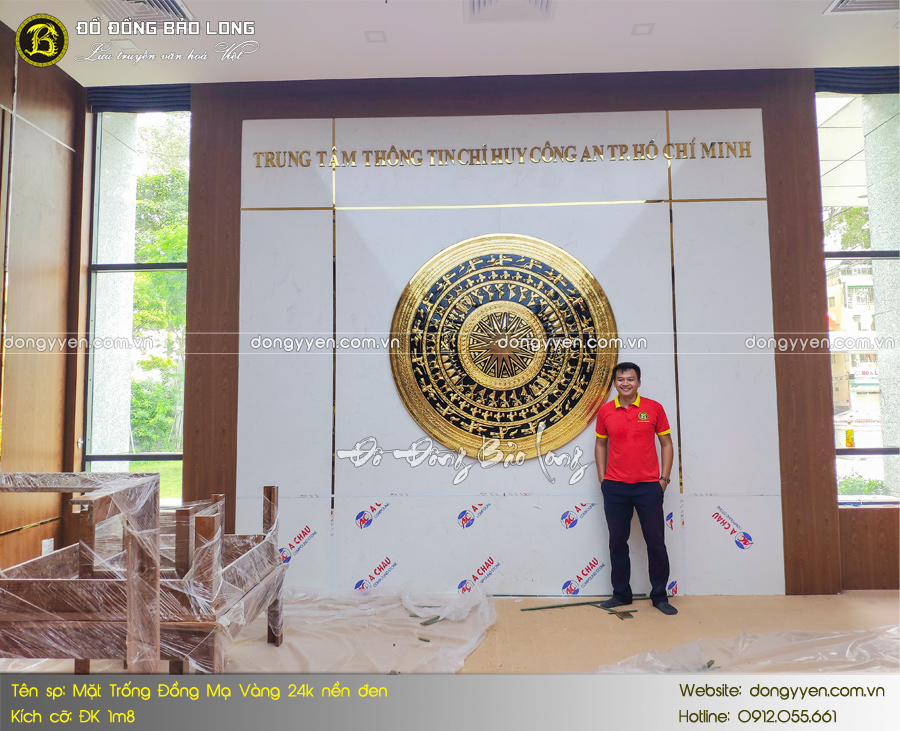 Mẫu Mặt trống đồng mạ vàng 24 được chế tác với kích cỡ đường kính 1m8, treo tại sảnh trung tâm hành chính của Công an Tp. HCM.