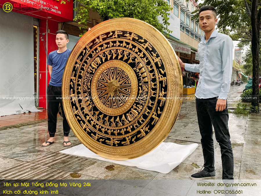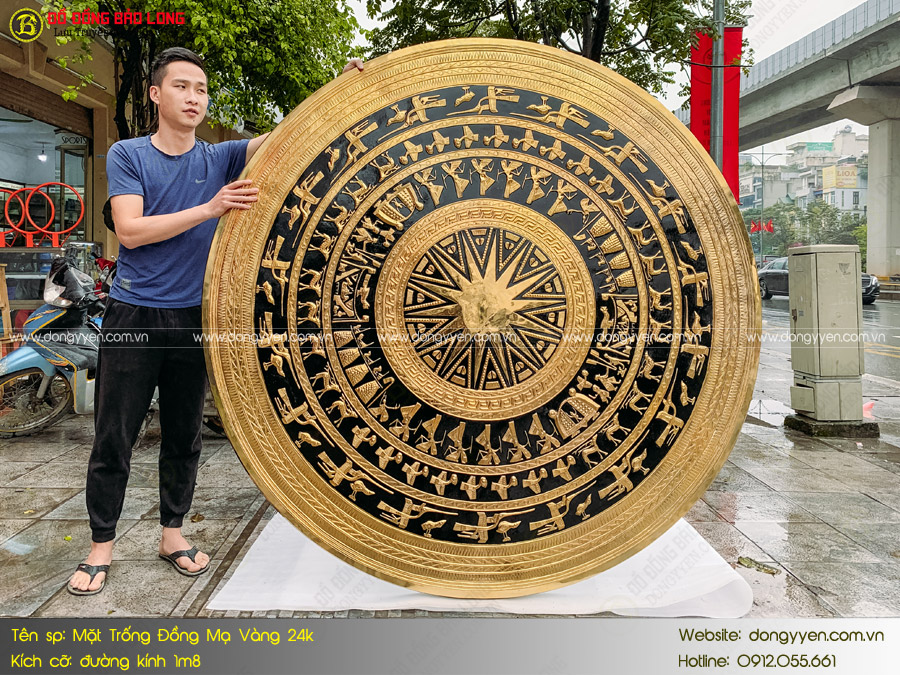 Mặt trống đồng 1m8 mạ vàng 24k là một trong những sản phẩm vừa được chuyển tới tay khách hàng. Mẫu sản phẩm được nhiều người ưa chuộng bởi giá thành hợp lý, tính thẩm mĩ cao. Ngoài ra, các chi tiết hoa văn được gò chạm thủ công rất tỉ mỉ, tinh tế. Chất liệu chế tác là đồng nguyên tấm nhập khẩu từ Hàn Quốc chuẩn 8 rem. Các nghệ nhân của Bảo Long tiến hành gò và chạm trên bề mặt tấn đồng nguyên cho tới khi hoàn thành một mặt trống hoàn chỉnh như hình ảnh. Bề mặt trống được phủ một lớp vàng 24k tăng vẻ đẹp và bảo vệ bức mặt trống tốt nhất.