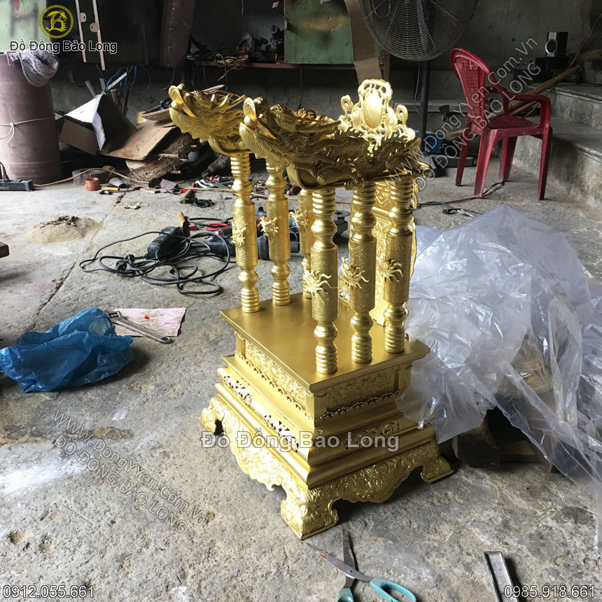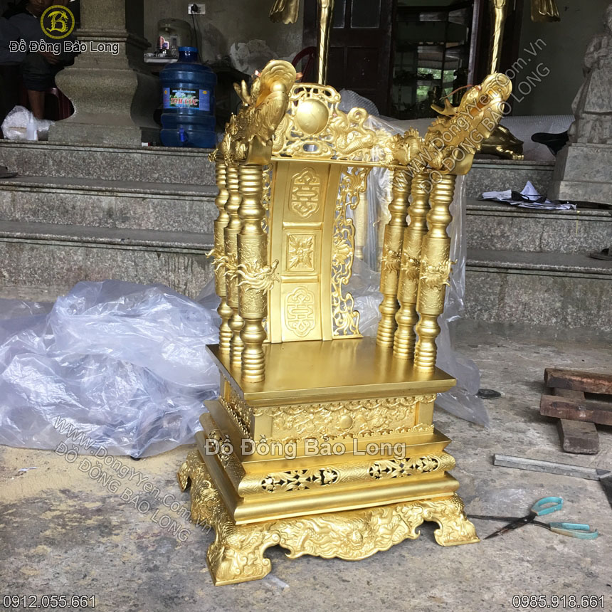 Đây là một trong những mẫu Ngai Thờ Bằng Đồng đẹp do cơ sở Bảo Long chế tác thủ công bằng đồng vàng loại đồng dày 1ly, gò chạm hoàn toàn bằng tay tinh xảo đến từng chi tiết nhỏ, màu vàng óng như thêp vàng, cao 68cm, đế rộng hơn 30cm.