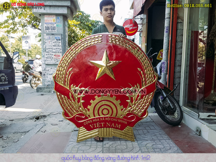 Quốc huy bằng đồng vàng hàng thúc tay tinh xảo, đồng dày, xương inox đường kính 1m2 cho khách ở Đồng Nai