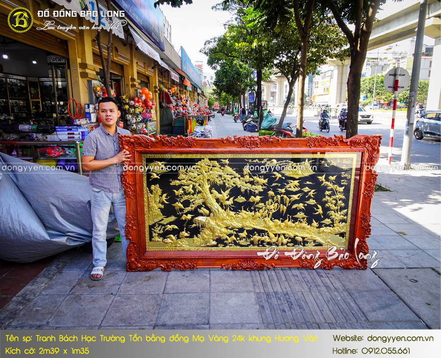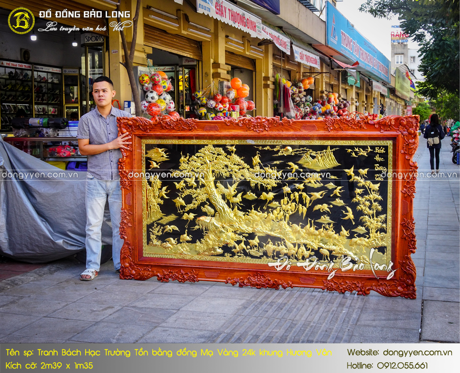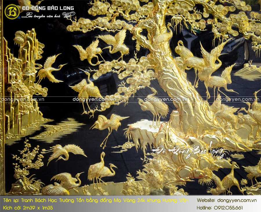 Tranh Bách Hạc Trường Tồn khung gỗ hương mạ vàng 2m39 x 1m35 là sản phảm mới nhất của chúng tôi chế tác cho khách hàng. Bức tranh được chế tác thủ công bởi các nghệ nhân lâu năm, màu sắc vàng nền đen. Tranh đồng sử dụng khung gỗ hương vân cao cấp. Cùng với vẻ đẹp và ý nghĩa may mắn, đây là lựa chọn được rất nhiều người yêu thích treo trong nhà hay phòng làm việc.