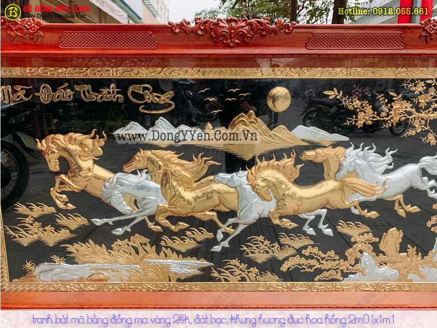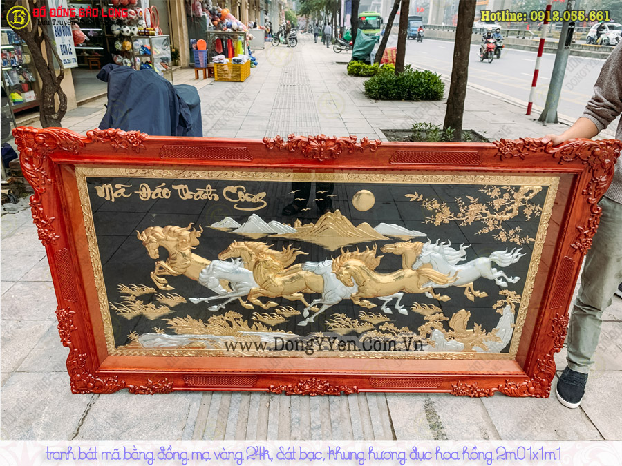 Tranh bát mã bằng đồng hàng chạm bộ, mạ vàng 24k toàn bộ, dát bạc 9999, khung gỗ hương đục hoa hồng tân cổ điển 2m01x1m1 cho khách Biên Hoà