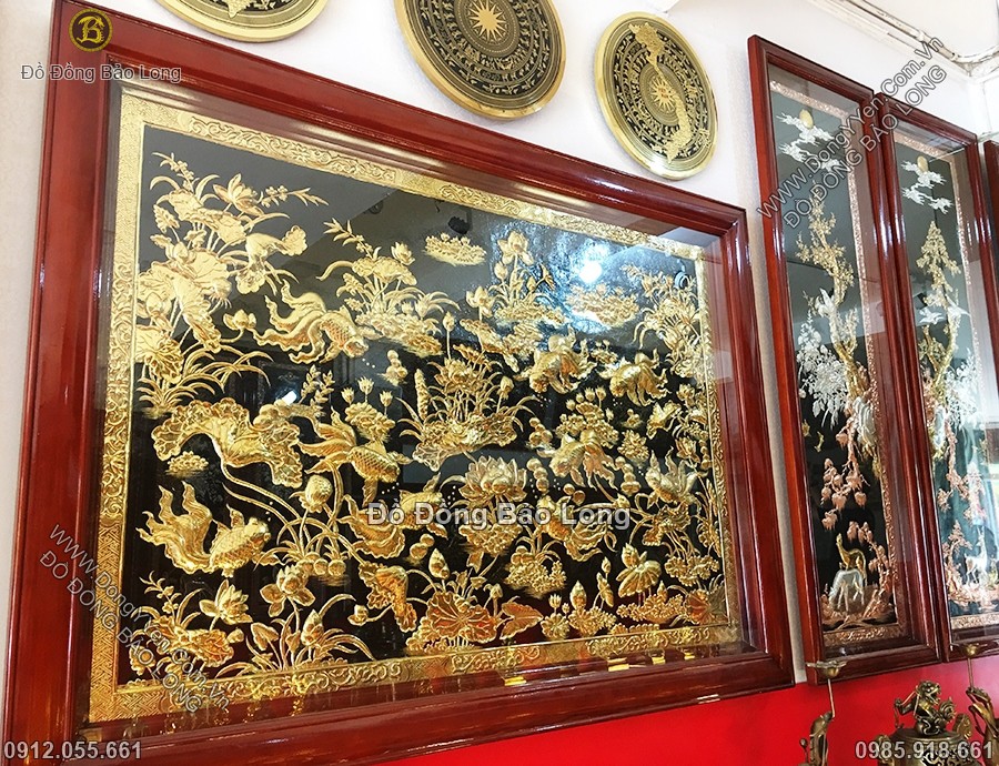 Tranh cá chép cửu ngư hoa sen quần tụ hàng độc đáo chạm đẳng cấp bằng đồng vàng 8rem, khung gỗ gụ mạ vàng 24k 1m47x107cm