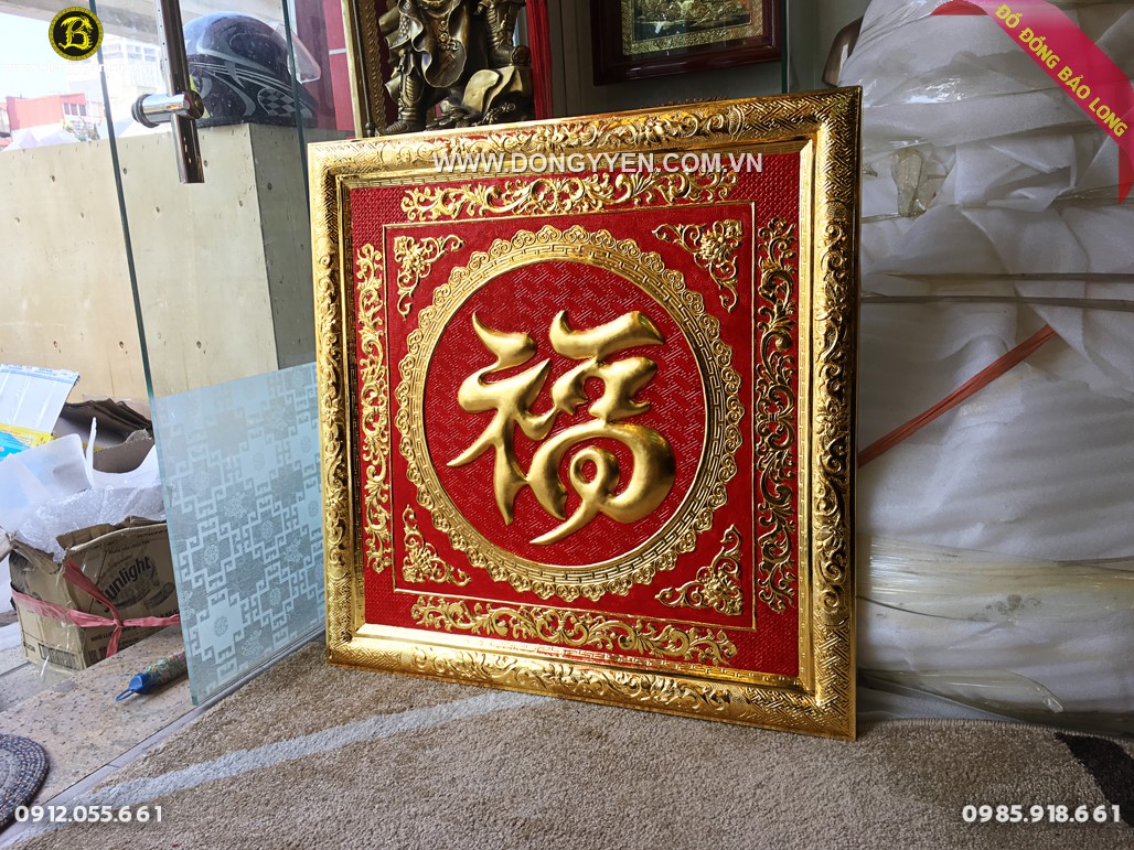 Tranh chữ Phúc khung liền đồng khổ vuông 81cm hàng chạm tay mạ vàng 24k toàn bộ sau đó dát vàng 9999 chữ Phúc ở giữa