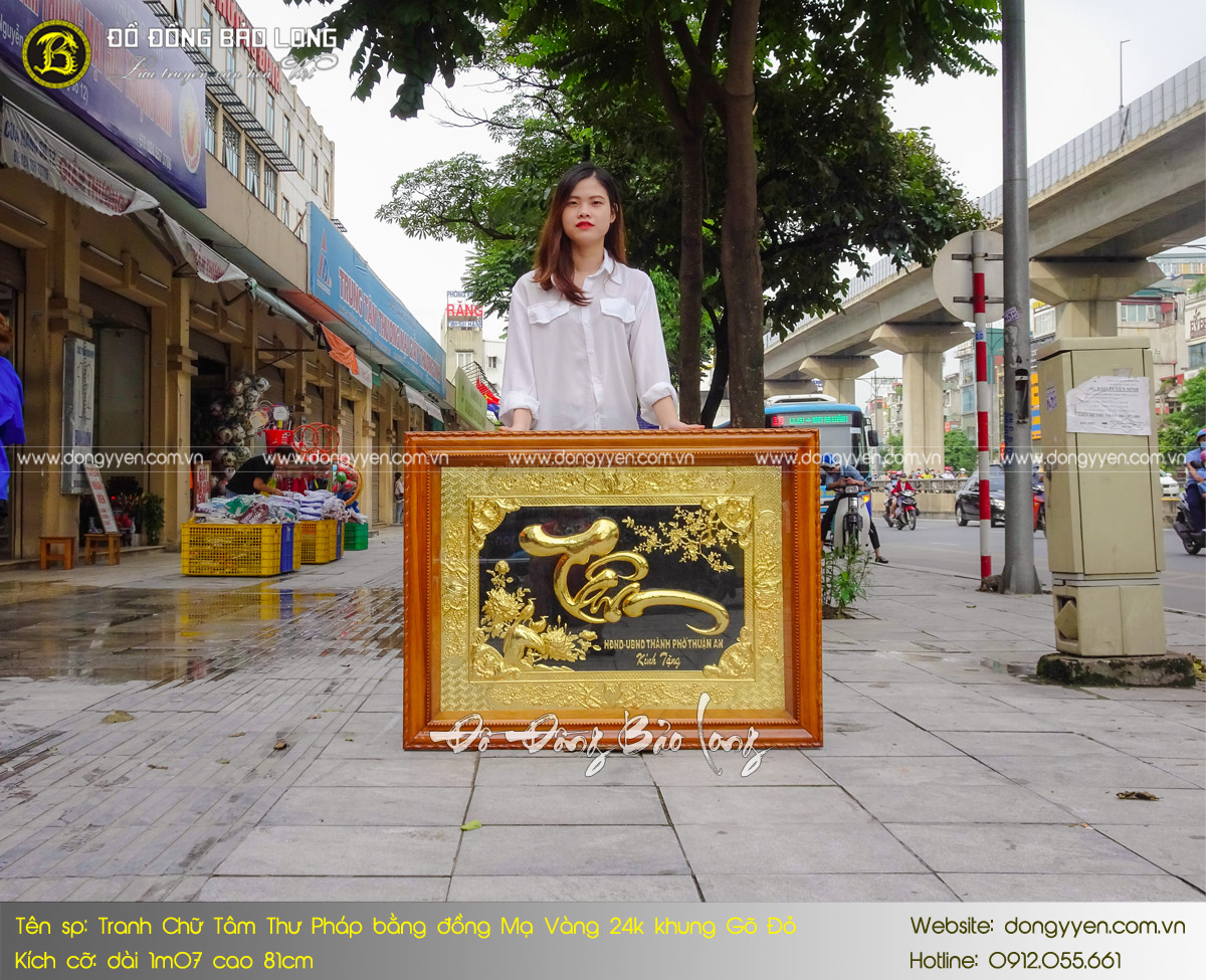 Tranh chữ Tâm bằng đồng mạ vàng 24k khung gỗ đỏ 1m07 x 81 cm mới đây được lựa chọn làm quà tặng cho các cơ quan nhà nước. Bức tranh không chỉ có vẻ đẹp thẩm mĩ mà còn mang ý nghĩa sâu sắc. Vì lí do này, nhiều người lựa chọn treo tranh trong nhà hay phòng