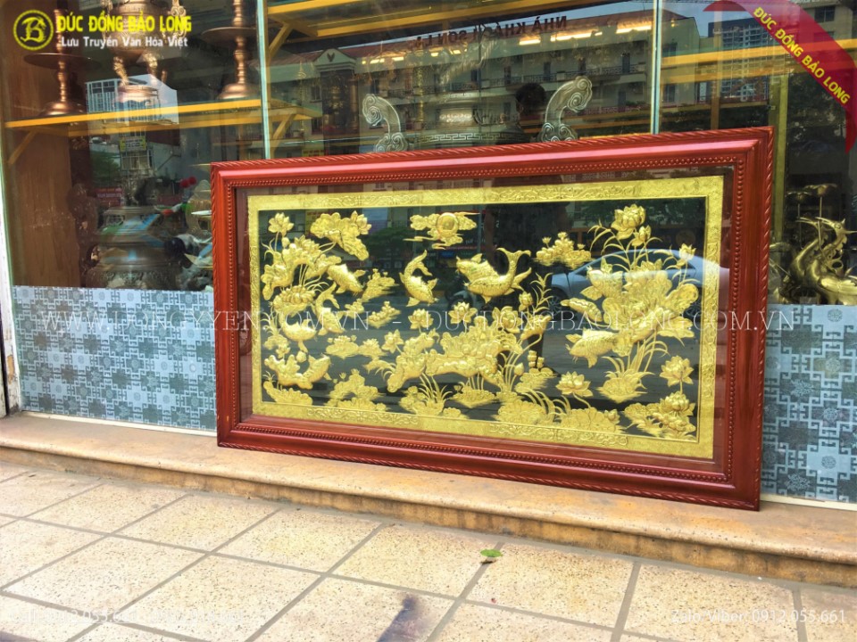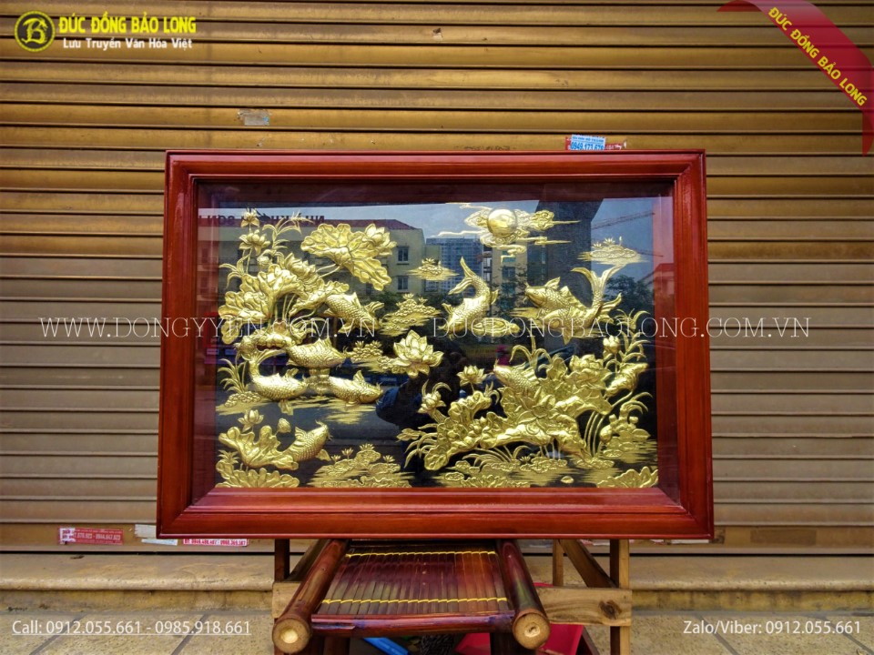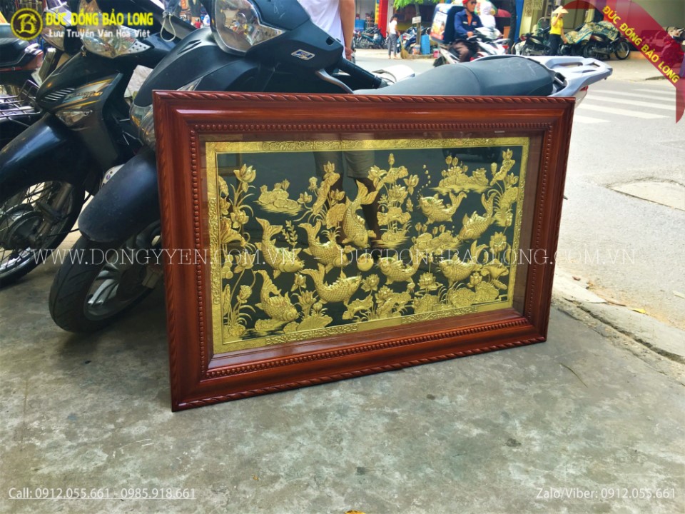 Tranh cửu ngư quần tụ bằng đồng khung gụ đục 1m76x89cm