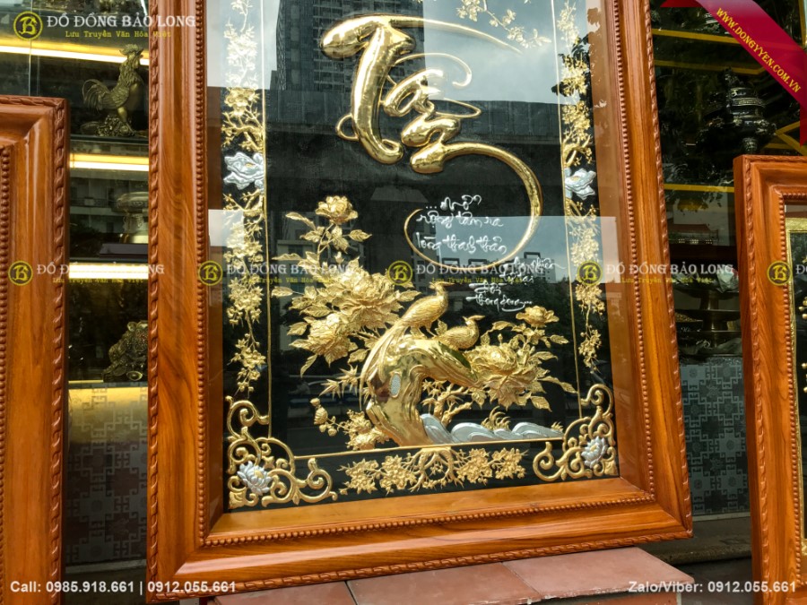 + Quy cách: Chạm thủ công 100%, mạ vàng 24k, dát bạc 9999, khung gỗ gõ