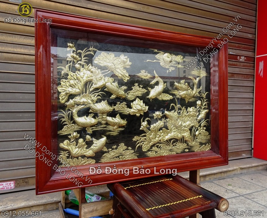 Tranh cửu ngư 9 con cá chép khổ nhỏ kích thước 86x61cm được chạm thủ công bằng tay từ đồng vàng dày dặn, khung gỗ trò đẹp