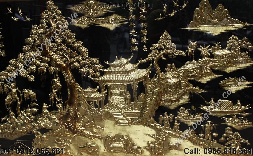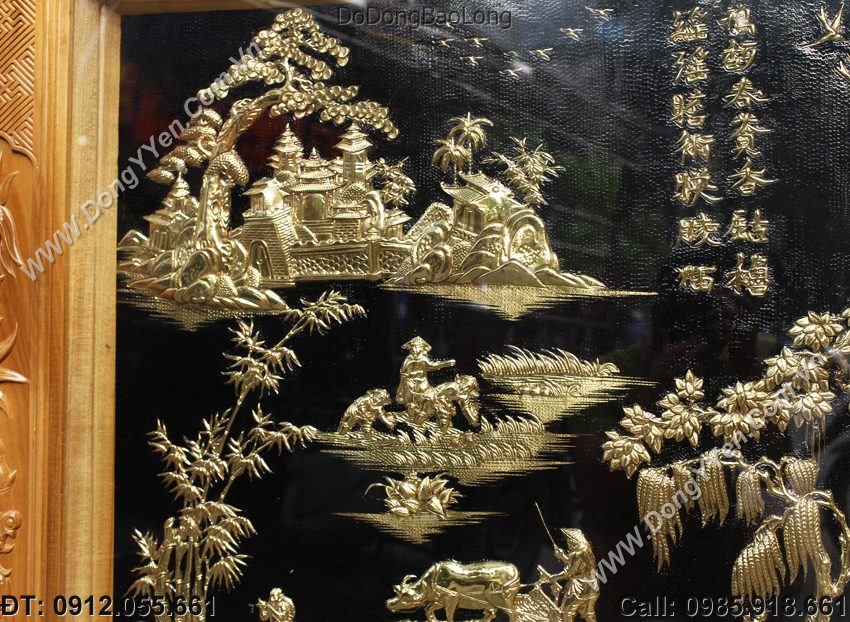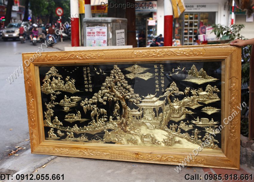 Tranh đồng quê treo phòng khách, phòng thờ bằng đồng vàng hàng thủ công mỹ nghệ, khung gỗ dổi rộng 2m3 cực đẹp