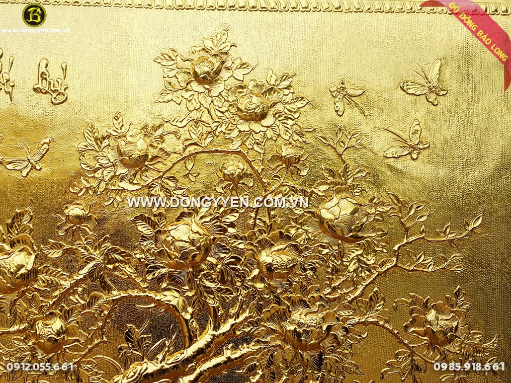 Tranh Vinh hoa phú quý (hoa mẫu đơn) khổ dài 1m27 cao 88cm, hàng chạm tay thủ công bởi nghệ nhân của xưởng, Tranh chạm tinh xảo bằng đồng vàng dày 8rem 9đồng nhập khẩu hàn quốc), khung liền đồng chạm hoa mai, xương khung bằng inox. Tranh chạm tinh xảo tỉ mỉ hoa mẫu đơn (loài hoa tượng trưng cho sự giàu sang quý phái), sắc nét đến từng chi tiết nhỏ, được mạ phủ vàng ròng 24k bằng phương pháp điện phân nhúng bể cao cấp nhất hiện nay, cho màu sắc cực đẹp và độ bền gần như vĩnh cửu.