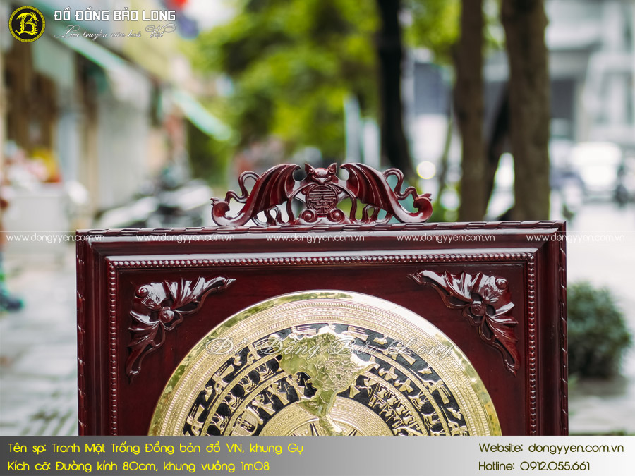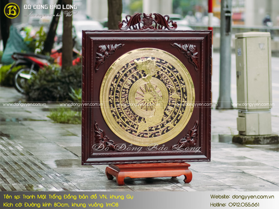 Tranh mặt trống đồng hình bản đồ đường kính 80cm, khung gỗ gụ vuông 1m08 đục đẹp hoàn thiện cho khách ở Đồng Hới - Quảng Bình