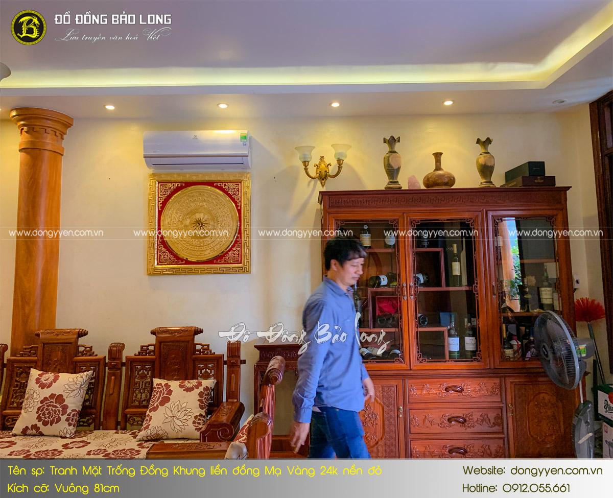 Tranh Mặt trống đồng khung liền đồng mạ vàng 24k khổ vuông 81cm có kiểu dáng độc đáo, màu sắc bắt mắt. Mẫu sản phẩm được nhiều người ưa chuộng bởi giá thành hợp lý, tính thẩm mĩ cao. Ngoài ra, các chi tiết hoa văn được chạm thủ công rất tỉ mỉ, tinh tế. Chất liệu chế tác là đồng nguyên tấm nhập khẩu từ Hàn Quốc chuẩn 8 rem. Các nghệ nhân của Bảo Long tiến hành gò và chạm trên bề mặt tấm đồng nguyên cho tới khi hoàn thành một bức tranh mặt trống hoàn chỉnh như hình ảnh.