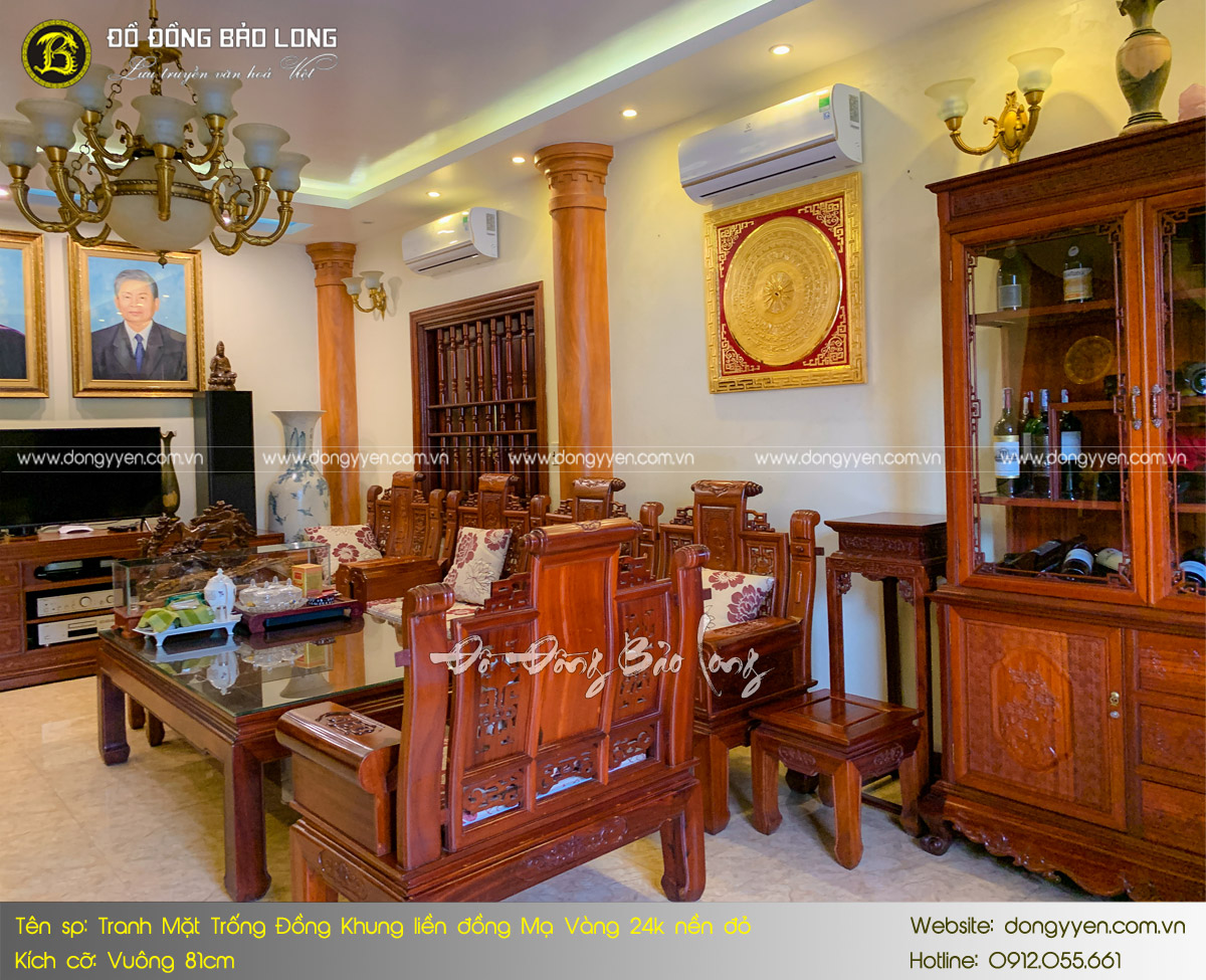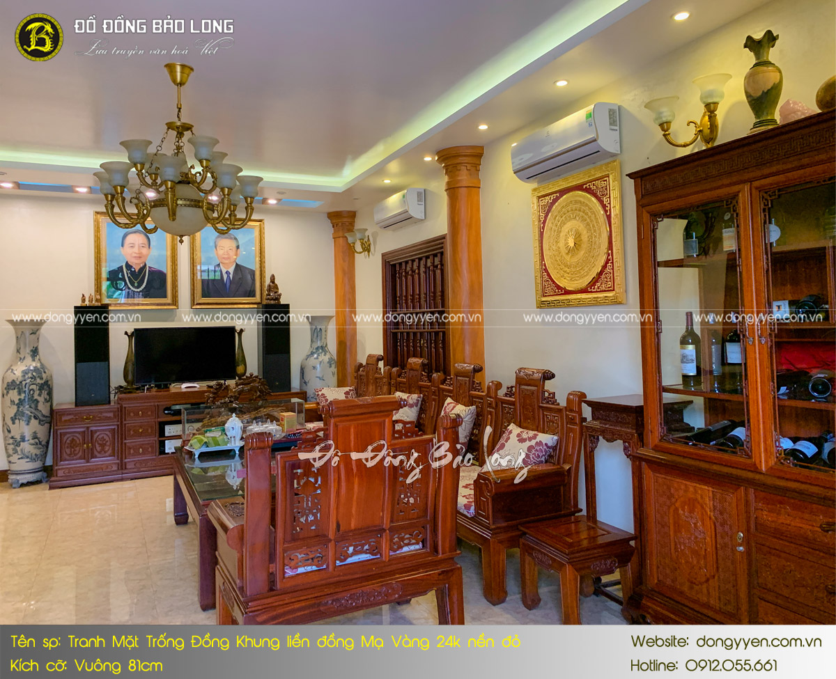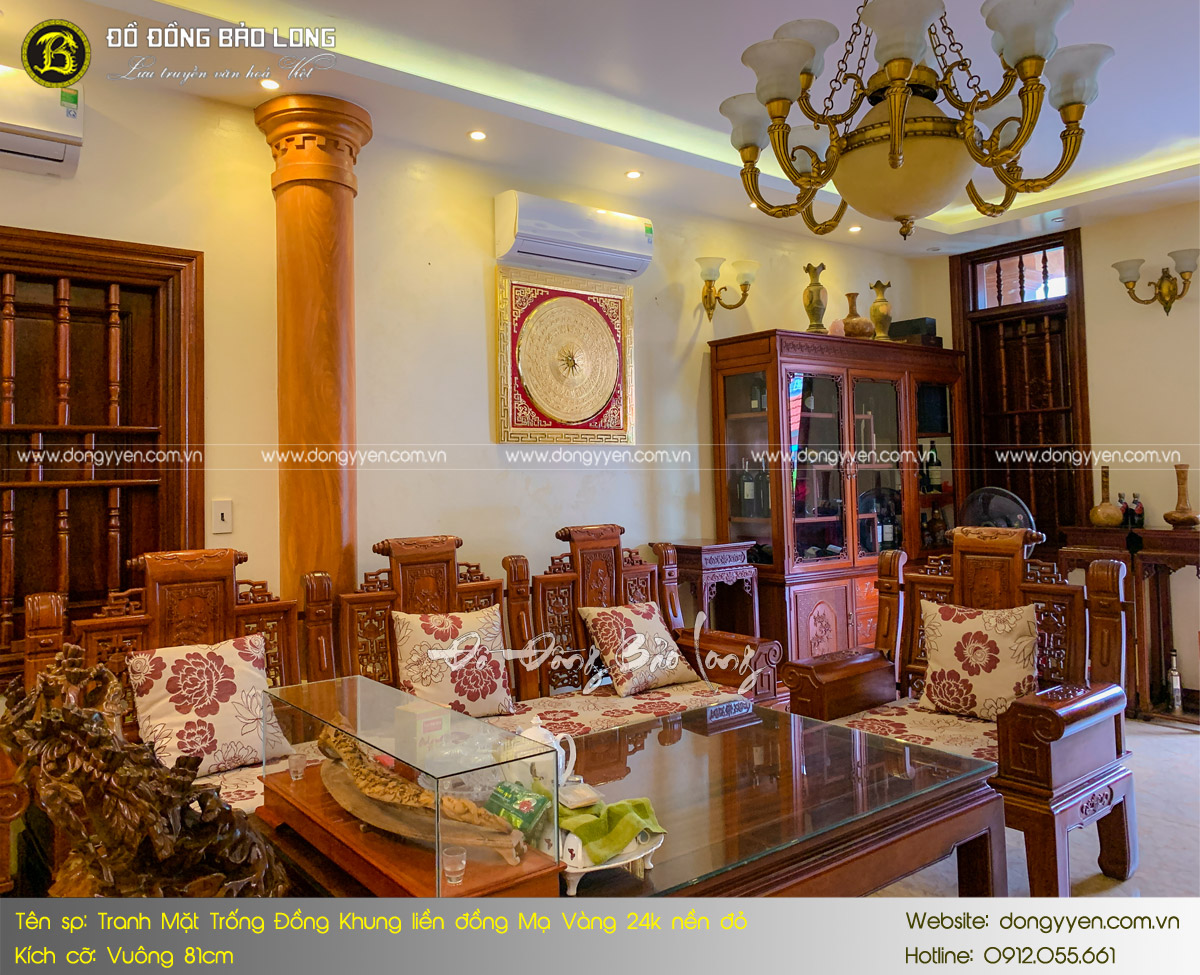Tranh mặt trống đồng khung liền đồng mạ vàng 24k khổ vuông 81cm