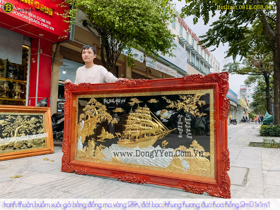 Tranh thuận buồm xuôi gió bằng đồng hàng chạm bộ, mạ vàng 24k toàn bộ, dát điểm bạc 9999 khung gỗ hương đục hoa hồng 2m01x1m1