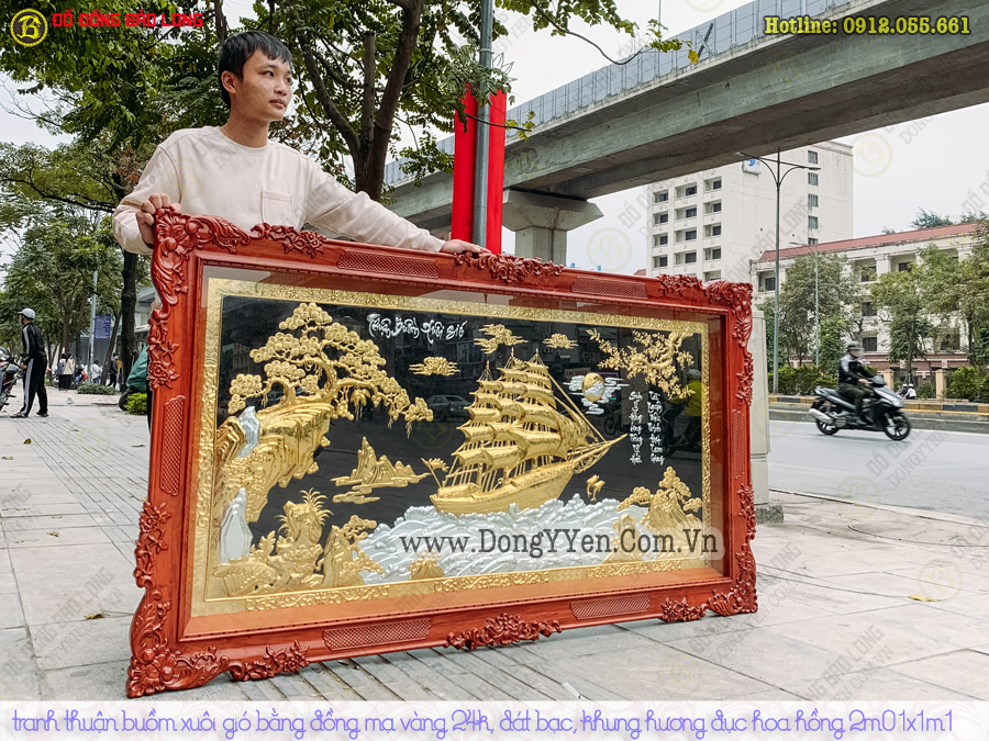 Tranh thuận buồm xuôi gió bằng đồng hàng chạm bộ, mạ vàng 24k toàn bộ, dát điểm bạc 9999 khung gỗ hương đục hoa hồng 2m01x1m1 cực đẹp hoàn thiện cho khách Sài Gòn.